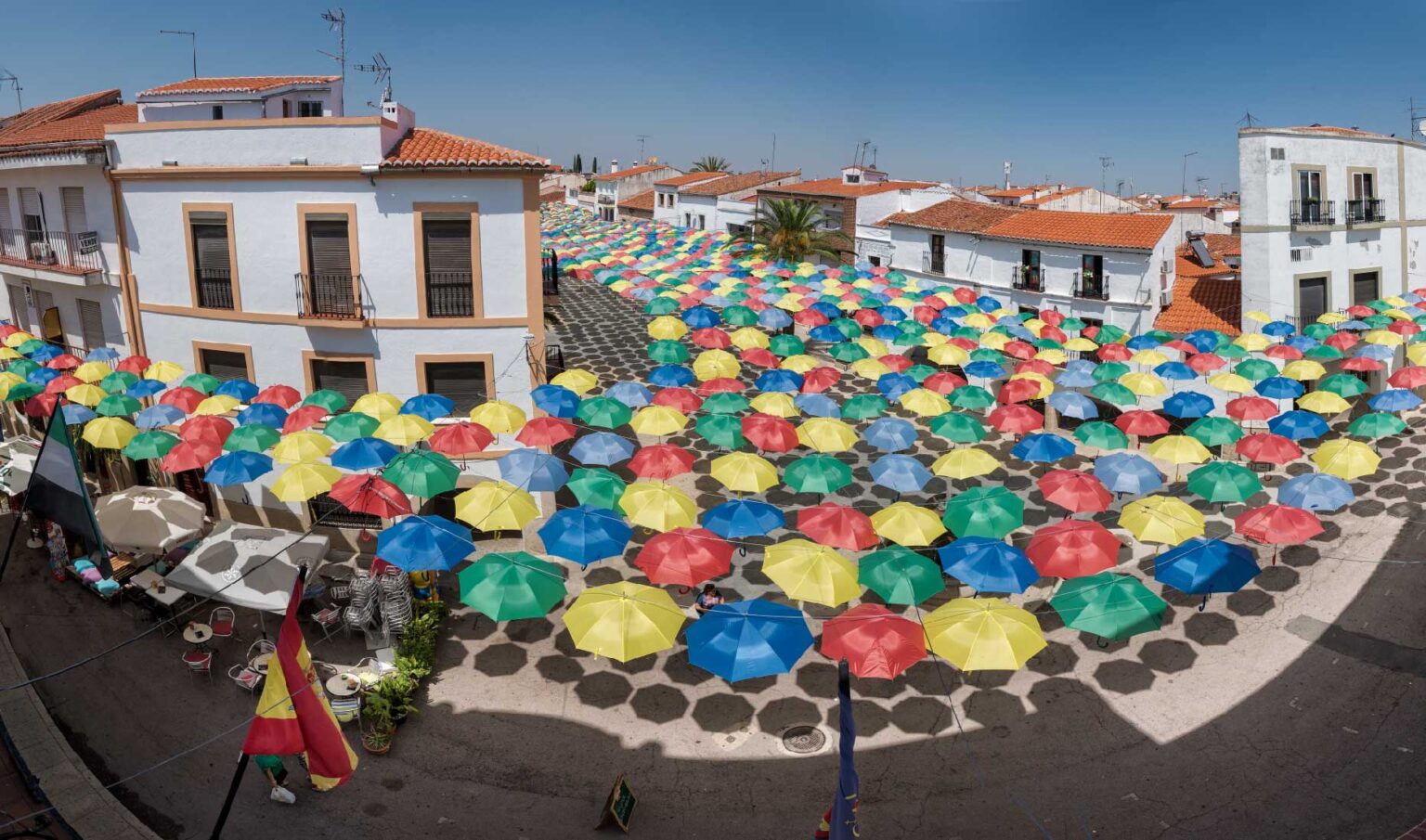 De mayo a septiembre la Plaza Mayor de Malpartida de Cáceres se cubre con un toldo de más de 1.500 paraguas de colores.